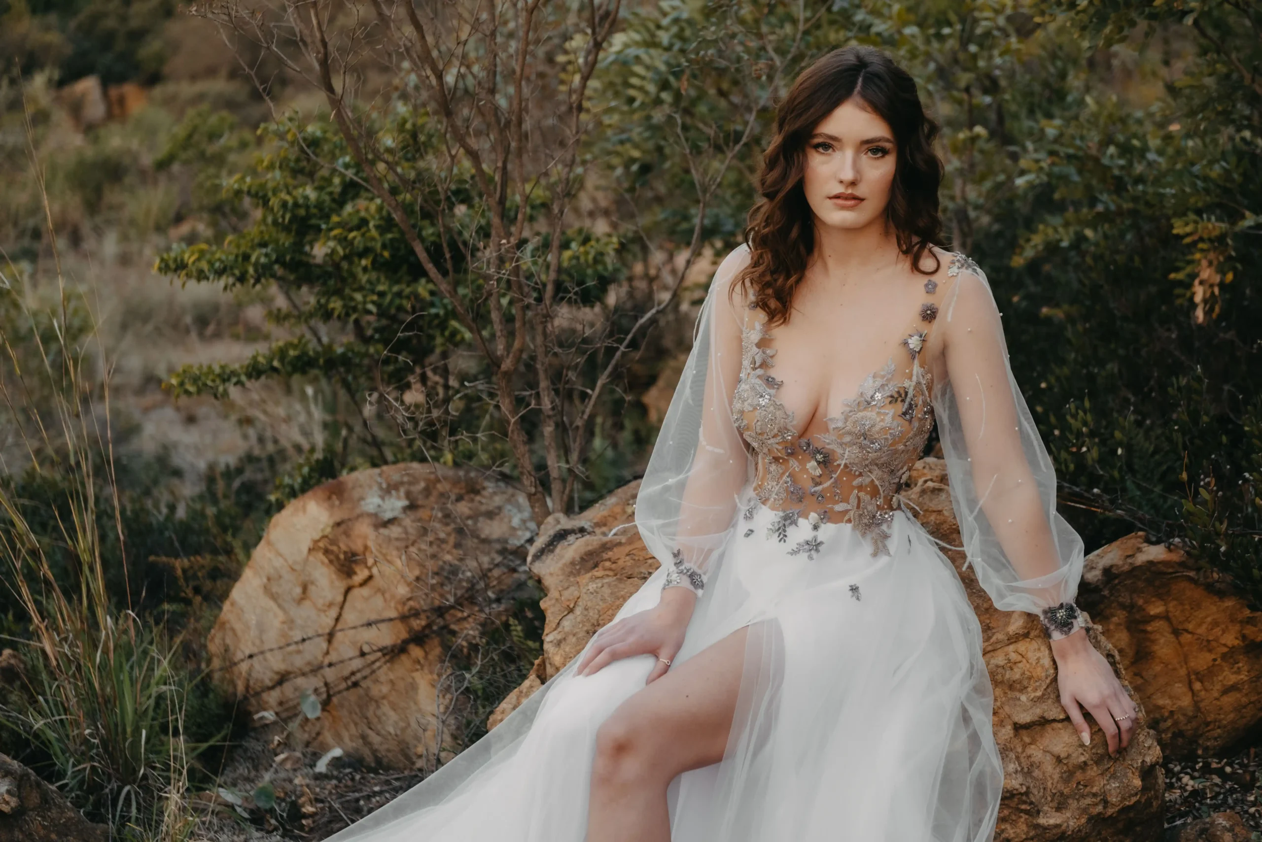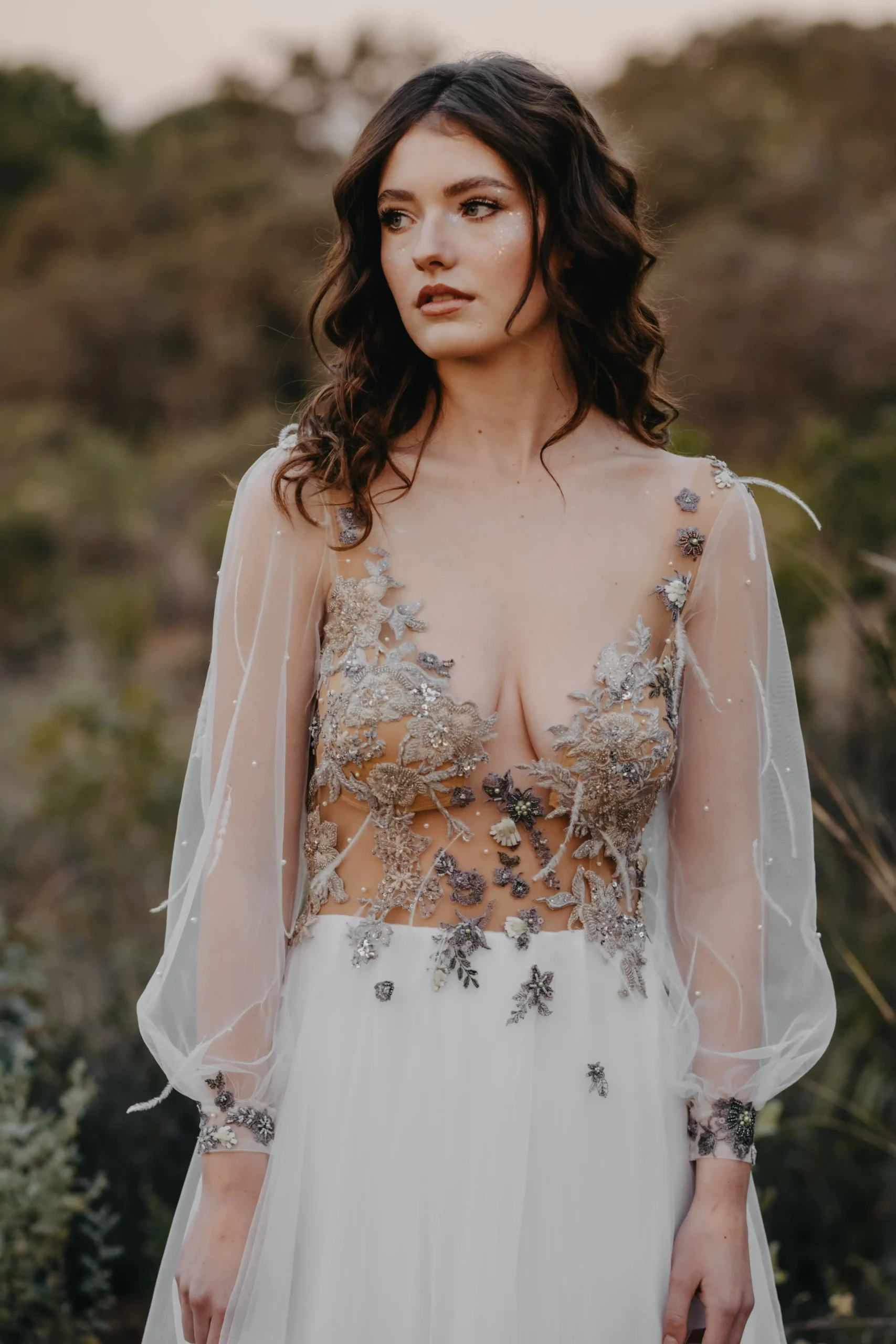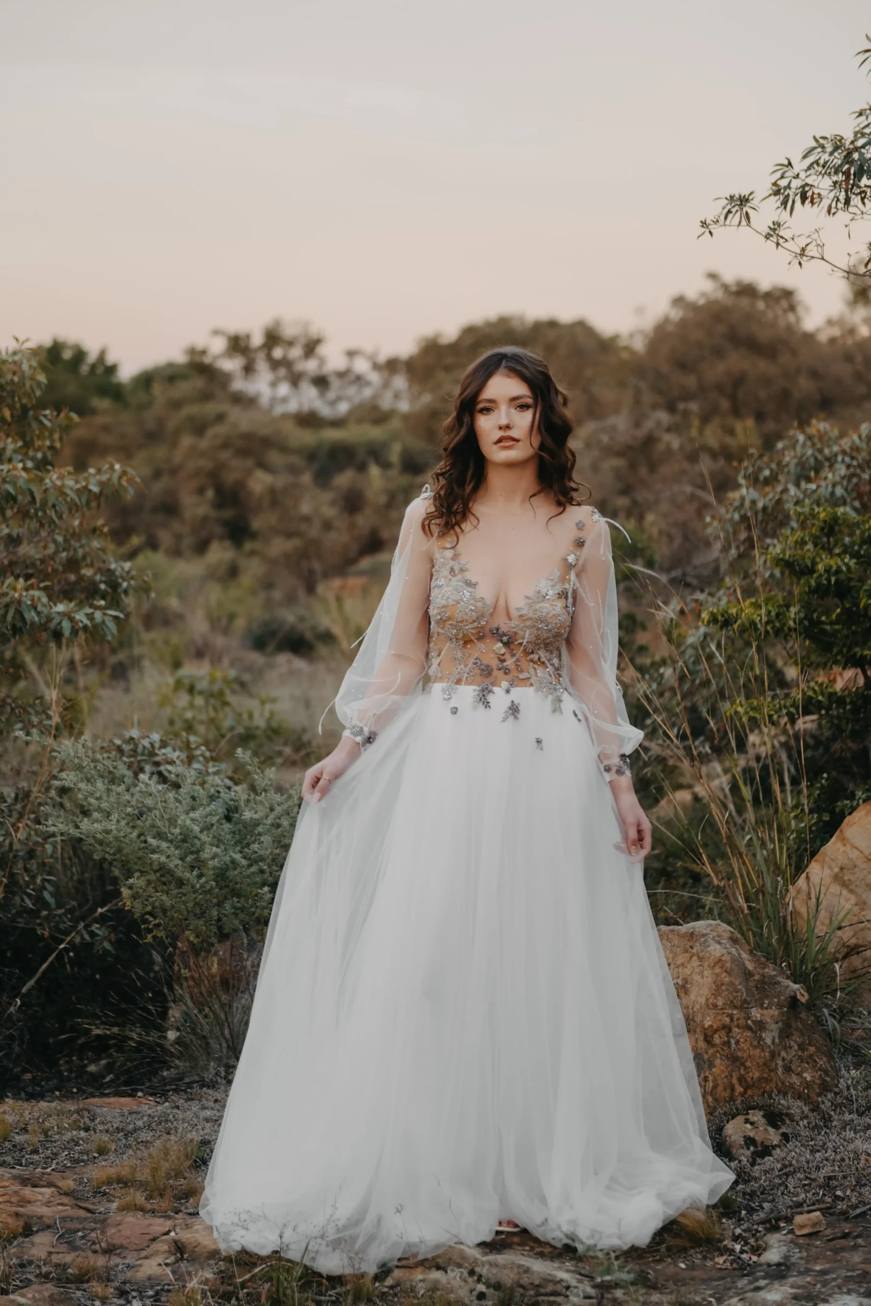 A daring plunge neckline is artfully balanced by long illusion sleeves, subtly voluminous and gathered at the wrist with delicately embroidered cuffs. The bodice melts into a flowing skirt of soft chiffon, layered for gentle fullness and movement. Sprigs of embroidered florals continue across the waistline giving the illusion of petals drifting in the wind. Subtle pearl accents and a barely-there shimmer elevate the gown’s ethereal charm, while maintaining a natural, grounded beauty.