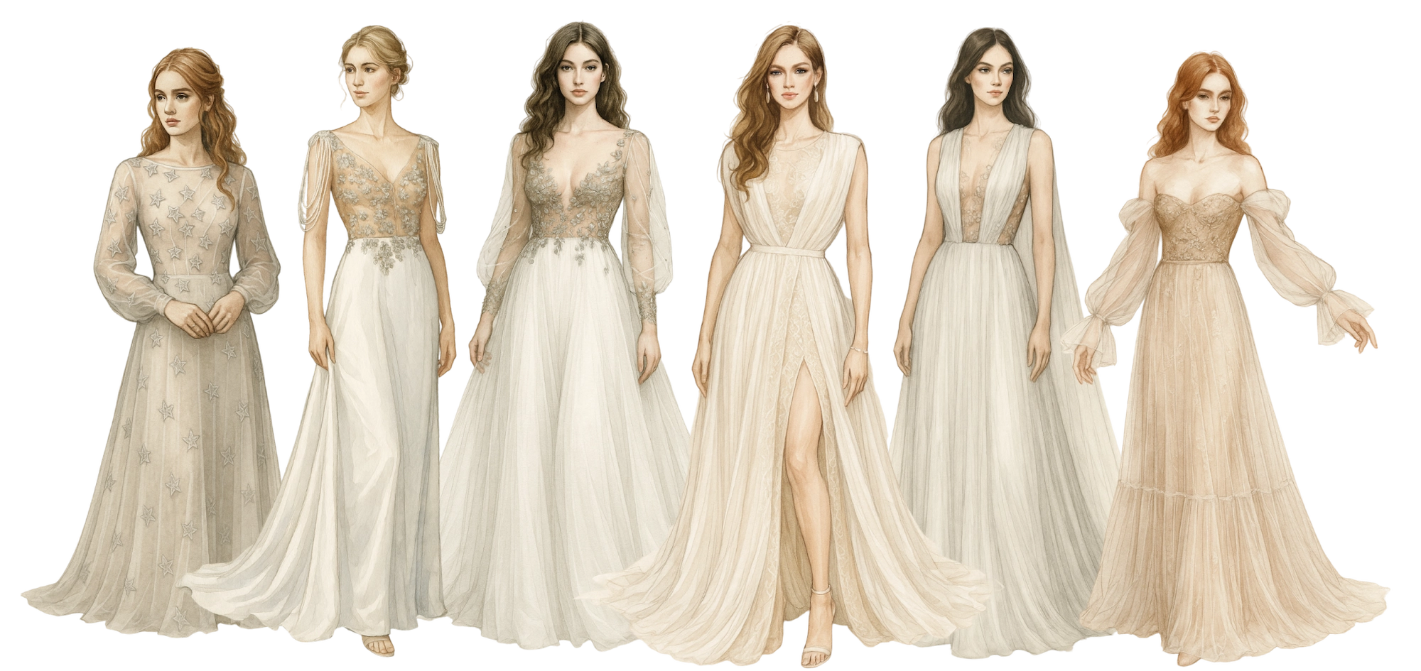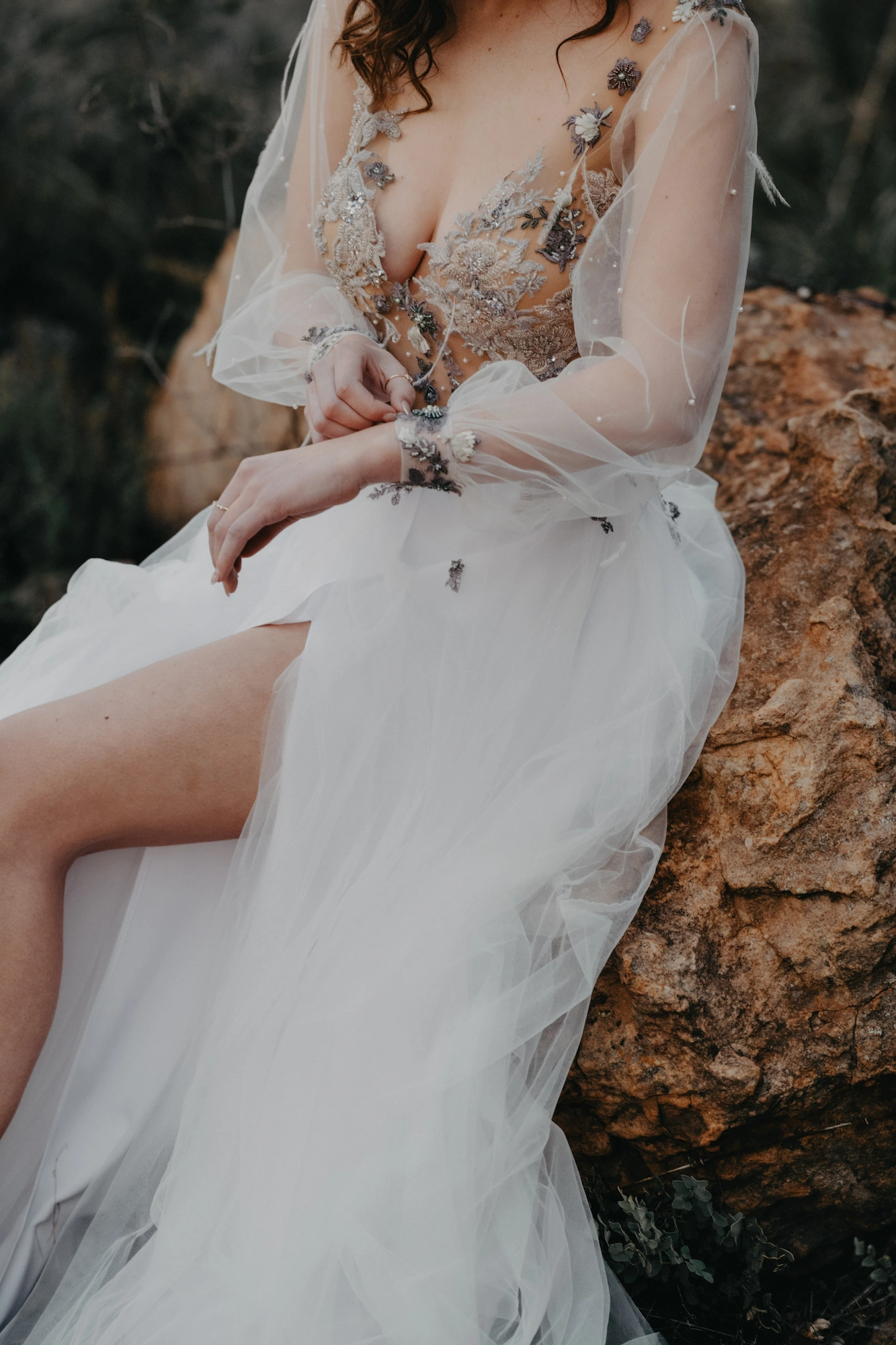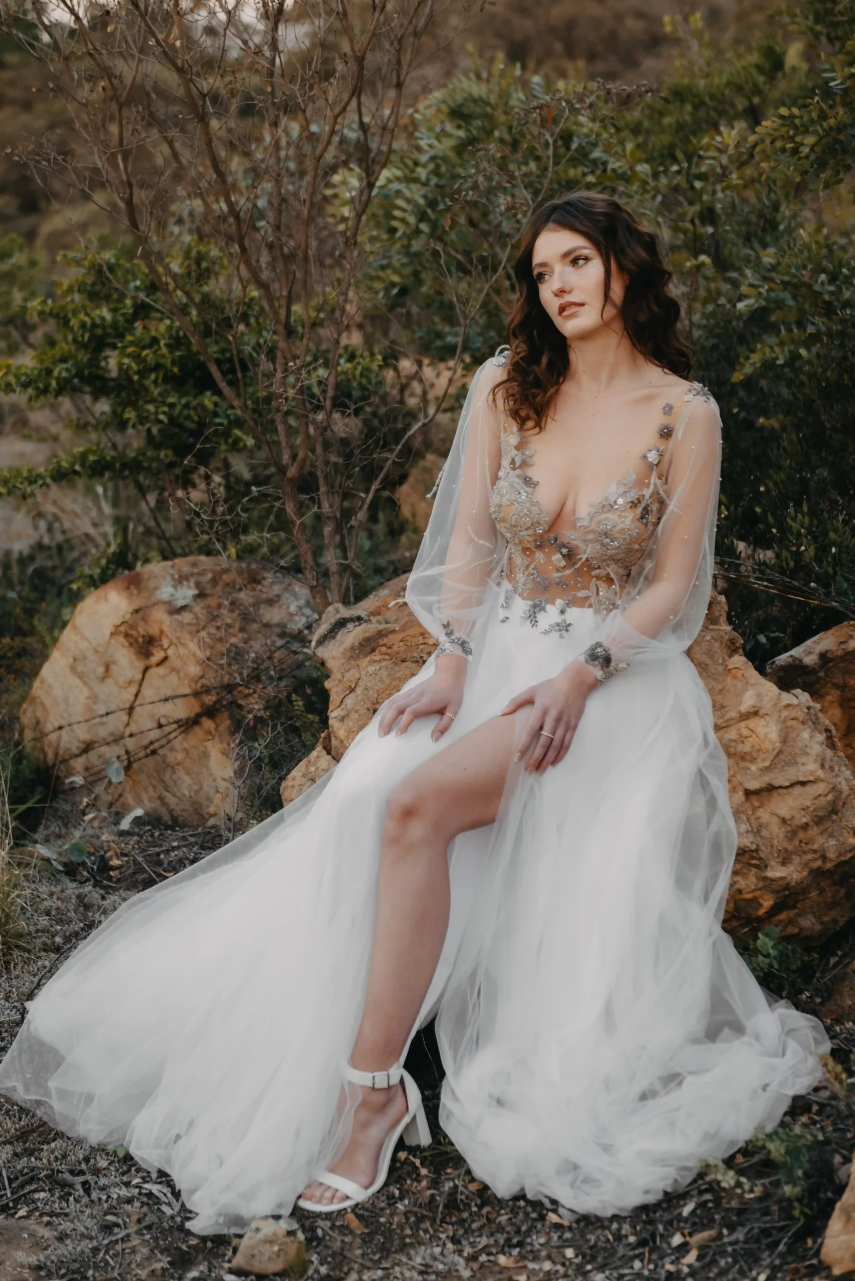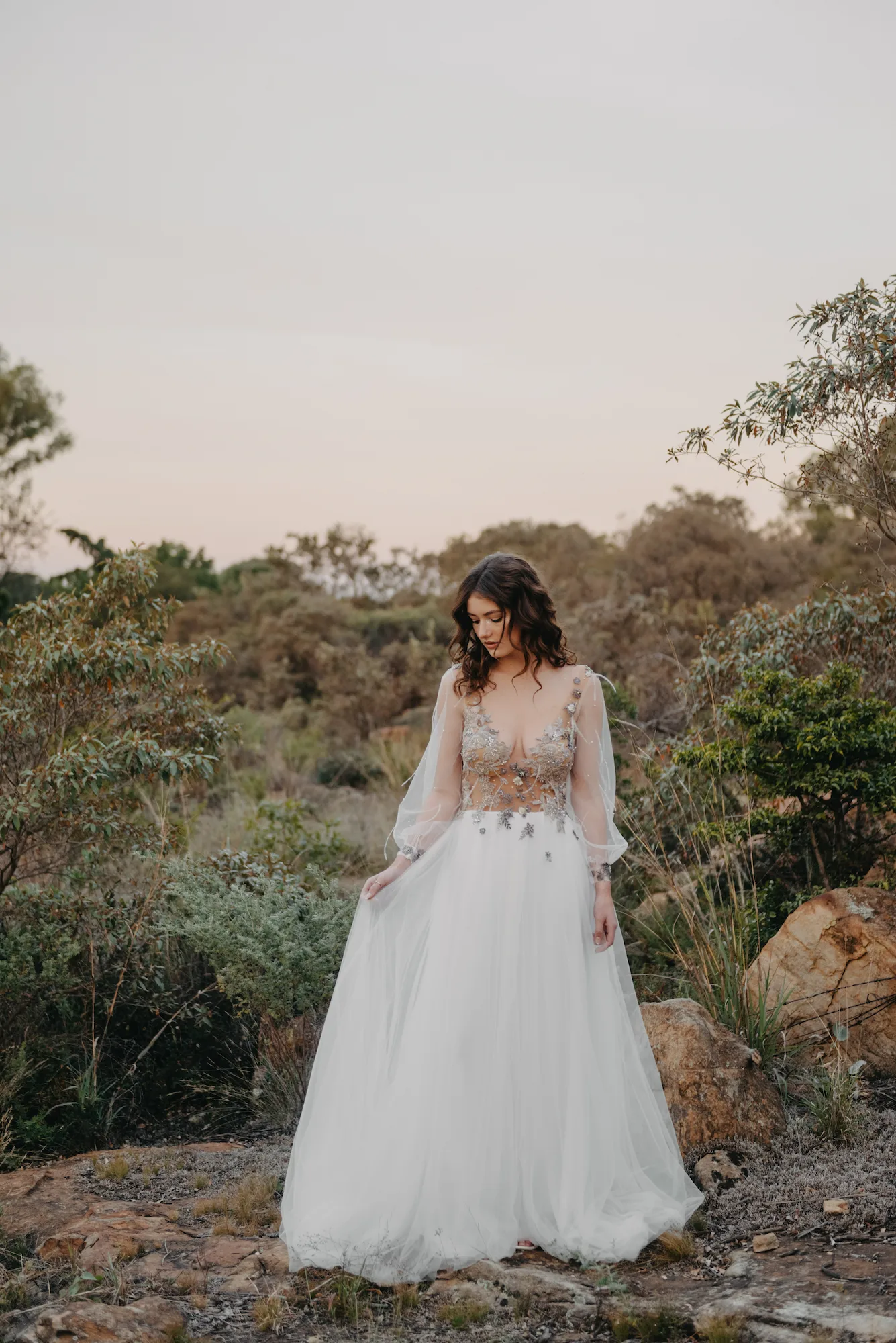 A daring plunge neckline is artfully balanced by long illusion sleeves, subtly voluminous and gathered at the wrist with delicately embroidered cuffs. The bodice melts into a flowing skirt of soft chiffon, layered for gentle fullness and movement. Sprigs of embroidered florals continue across the waistline giving the illusion of petals drifting in the wind. Subtle pearl accents and a barely-there shimmer elevate the gown’s ethereal charm, while maintaining a natural, grounded beauty.