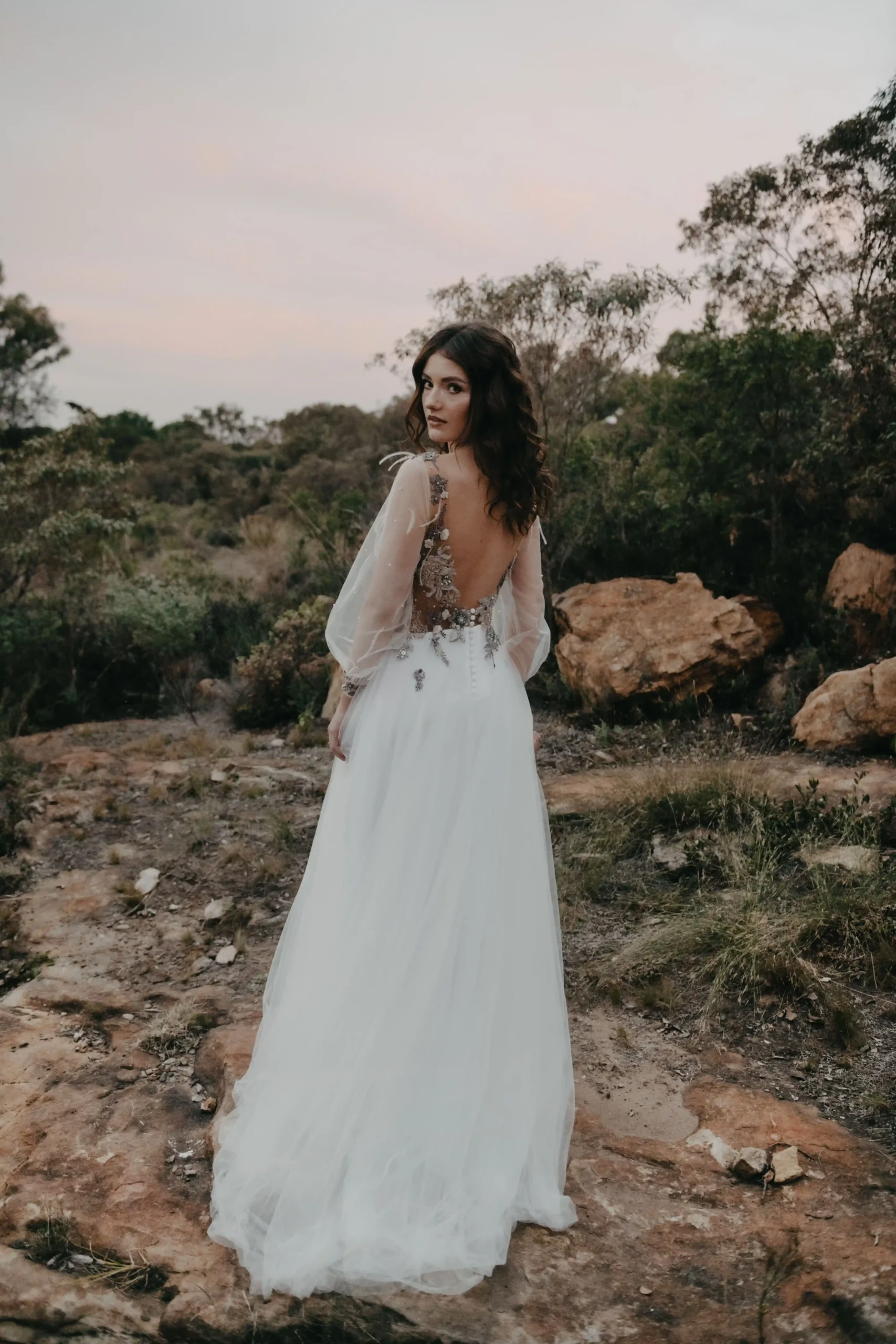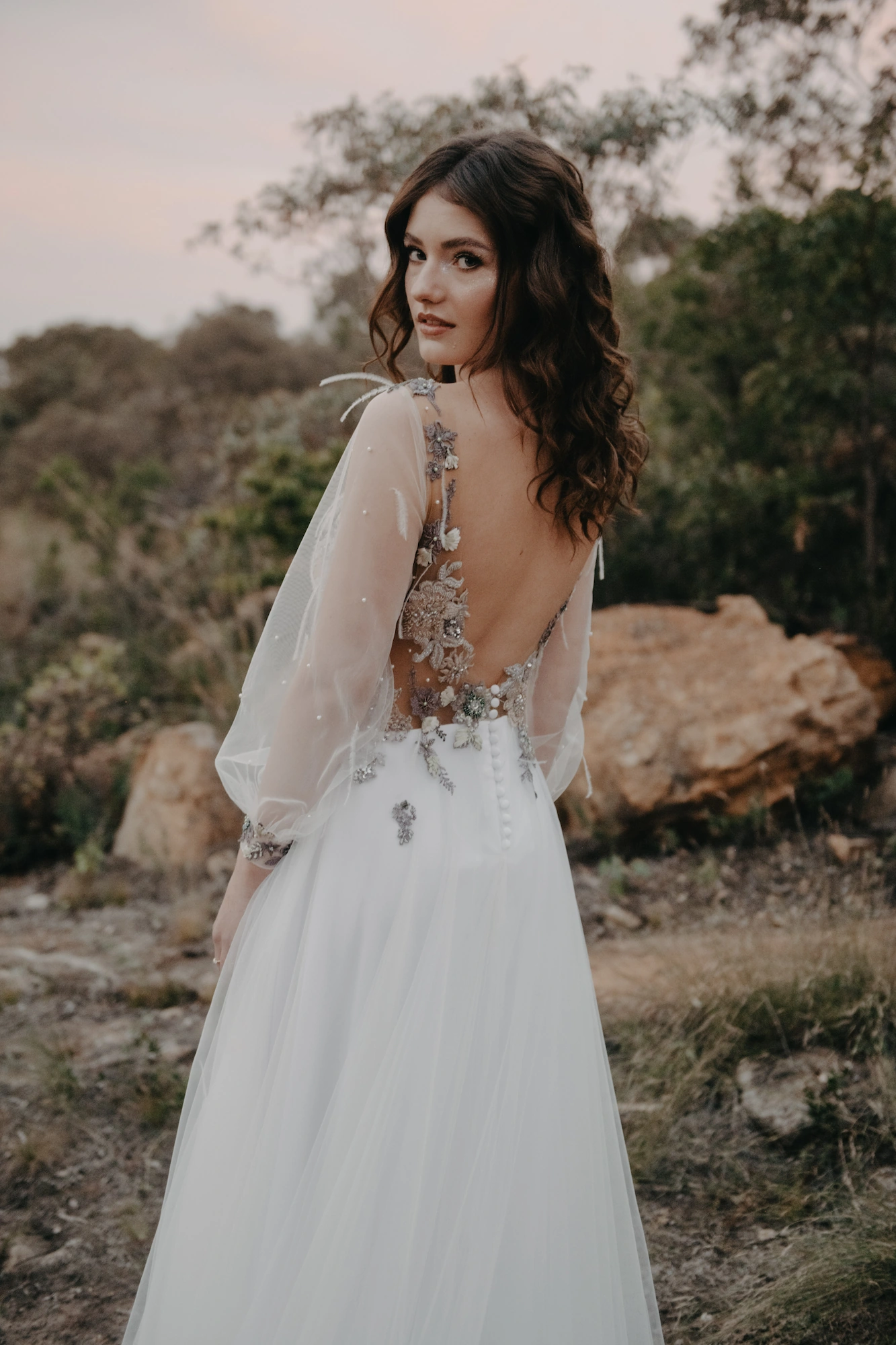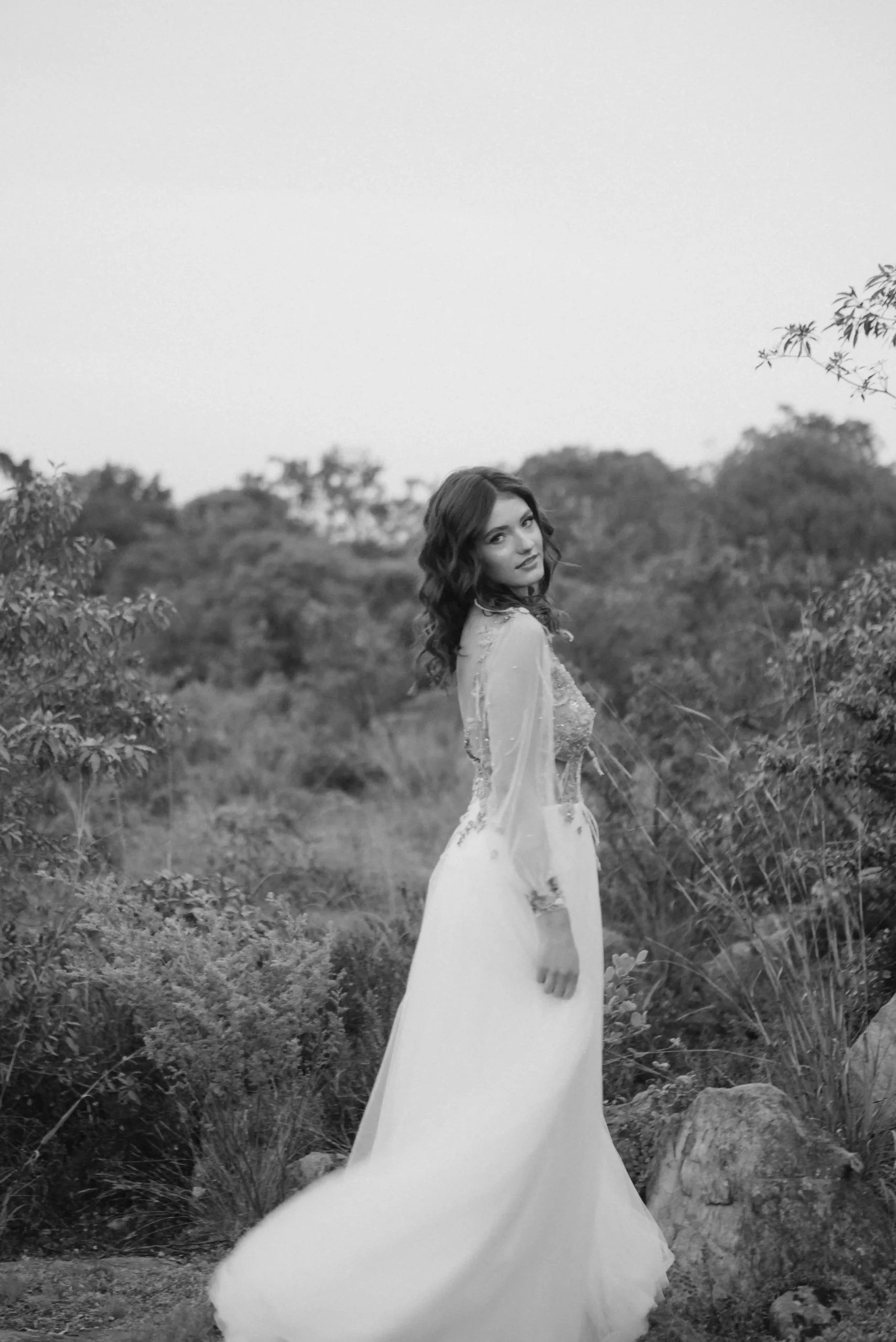 Whether it's an intimate mountain ceremony, a forest celebration, or a dusky field at golden hour, the Ophelia gown brings a soft luminosity and quiet power — made for the bride who leads with both grace and wildness.