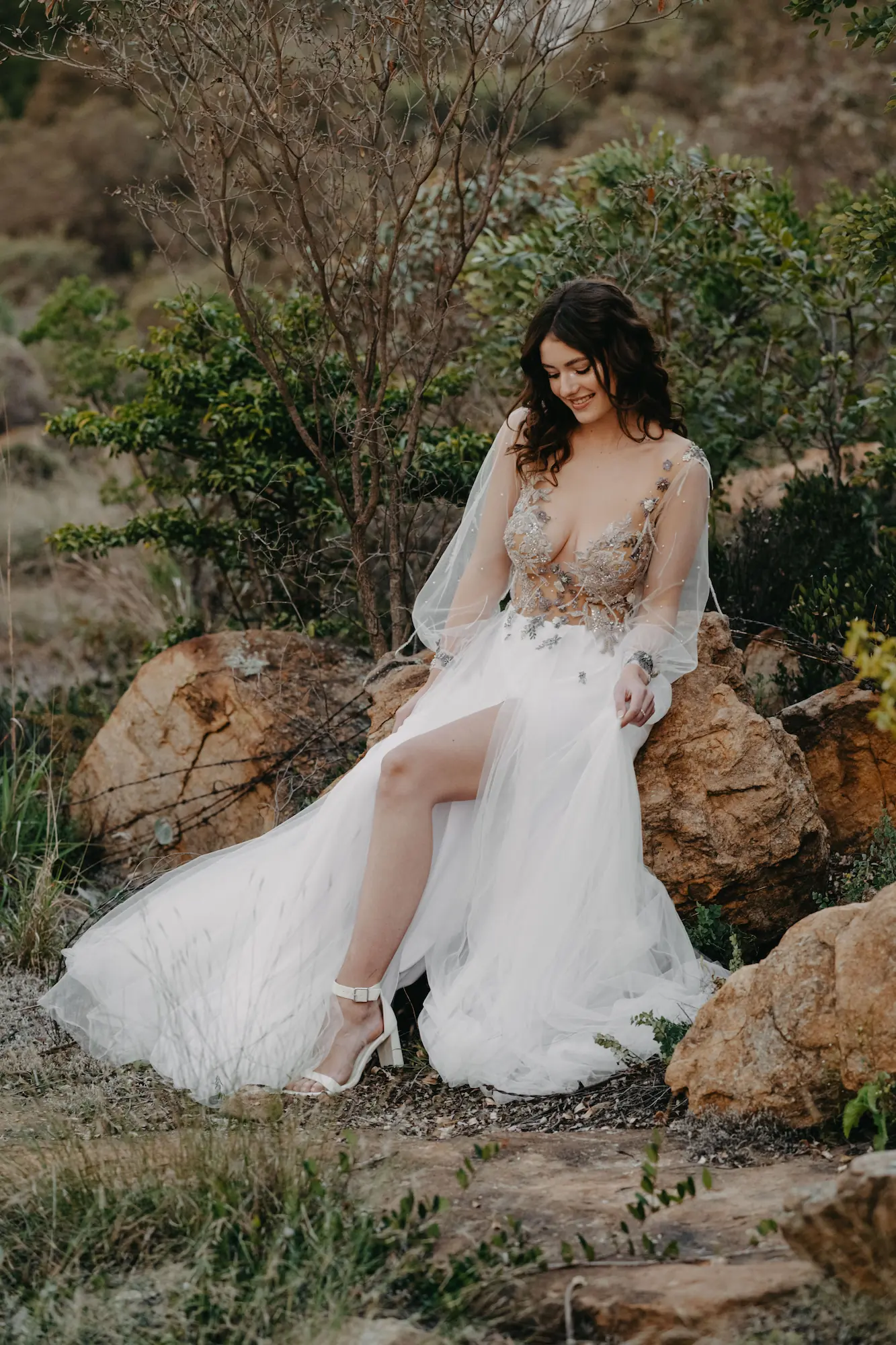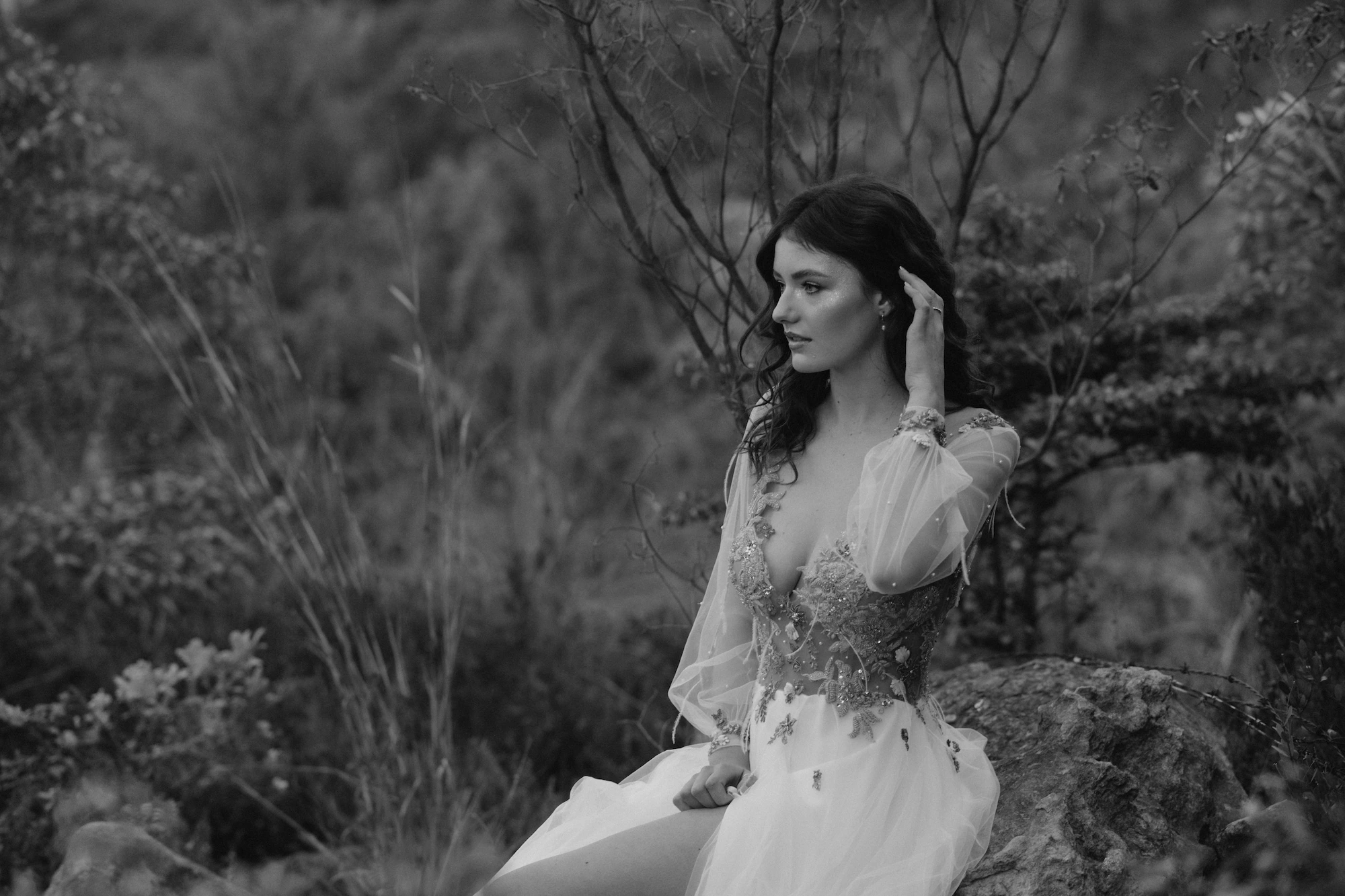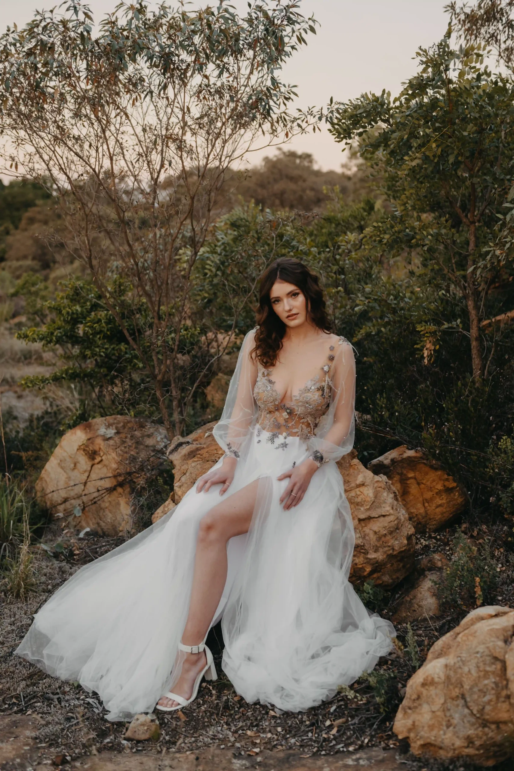 Whether it's an intimate mountain ceremony, a forest celebration, or a dusky field at golden hour, the Ophelia gown brings a soft luminosity and quiet power — made for the bride who leads with both grace and wildness.